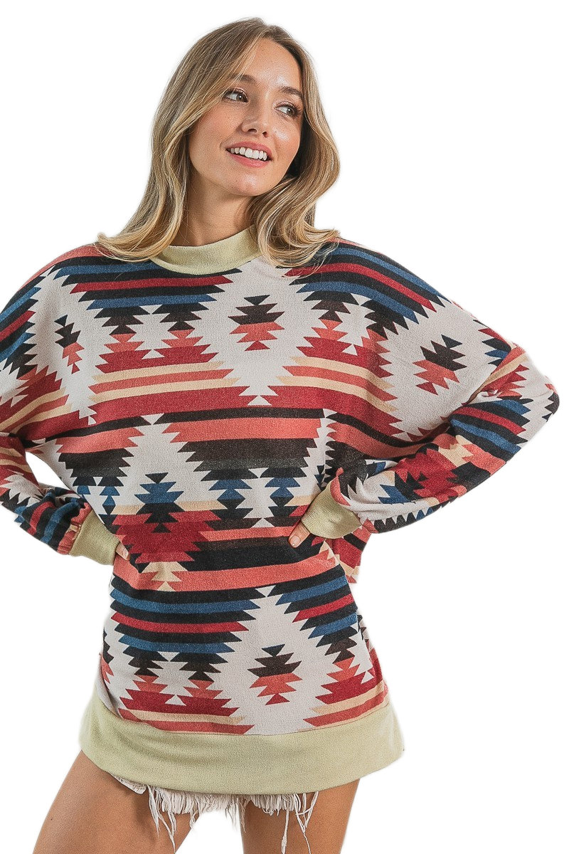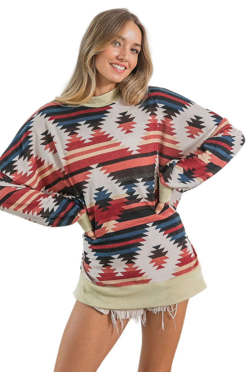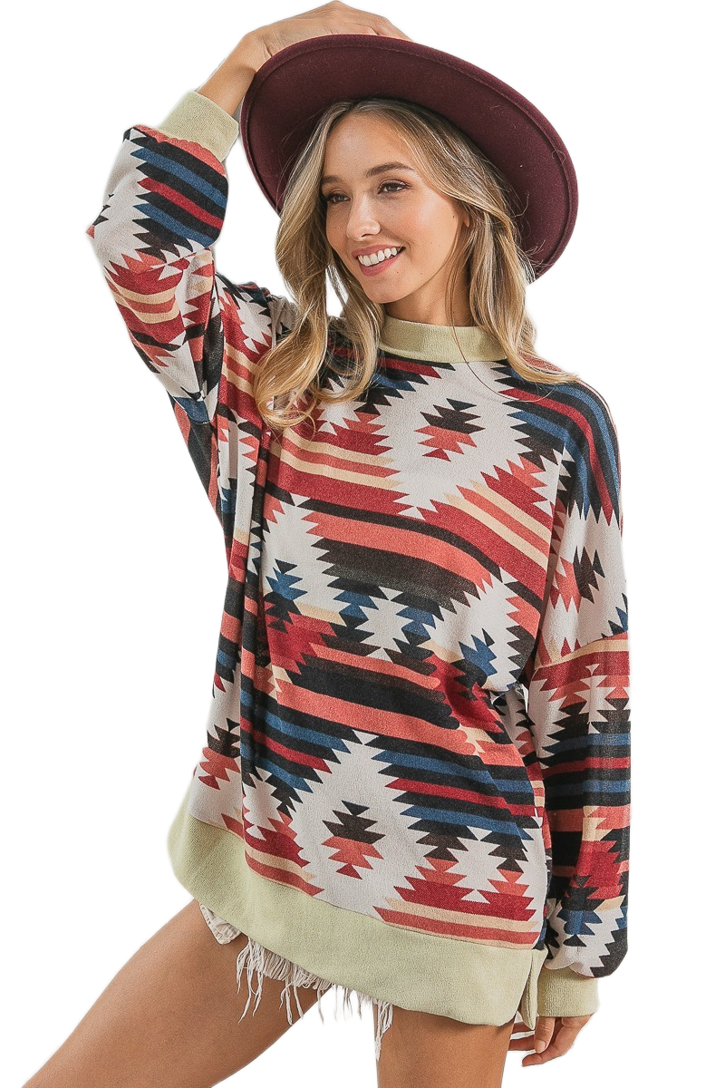 This stylish oversized long sleeve t-shirt features a vibrant Aztec geometric print in rich earth tones including coral, navy, and cream. Made from soft cotton blend fabric for ultimate comfort and breathability. The relaxed fit design offers a flattering silhouette while providing freedom of movement. Perfect for casual wear, weekend outings, or layering. The tribal-inspired pattern adds a bohemian touch to any wardrobe. Machine washable for easy care. Ideal for spring and fall seasons.