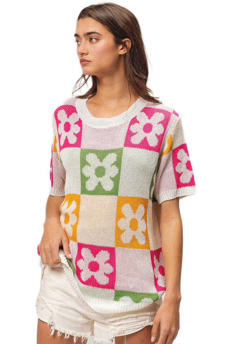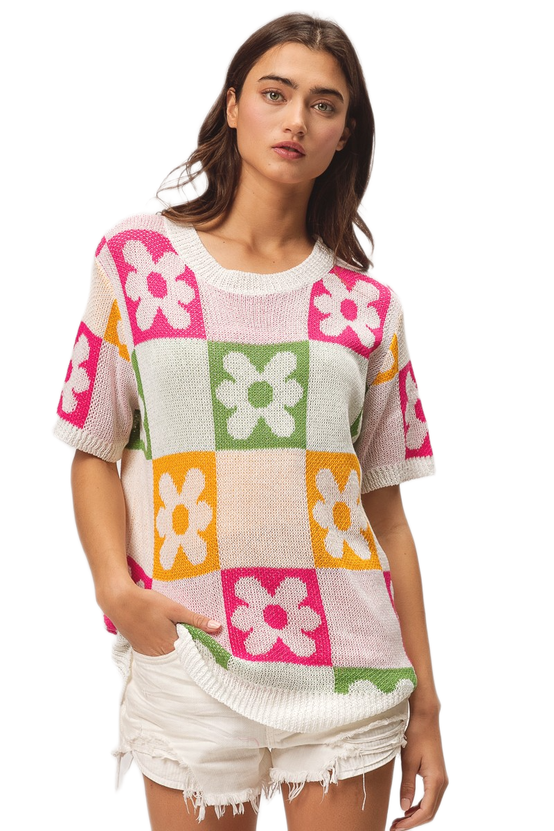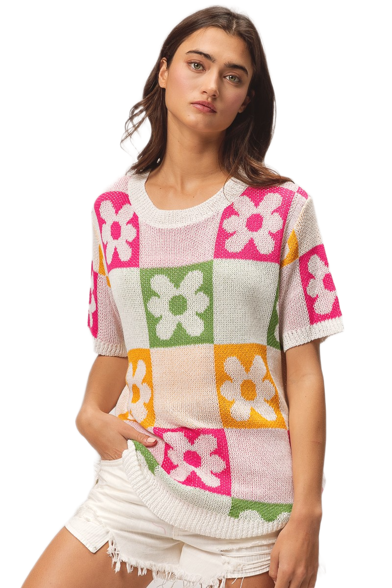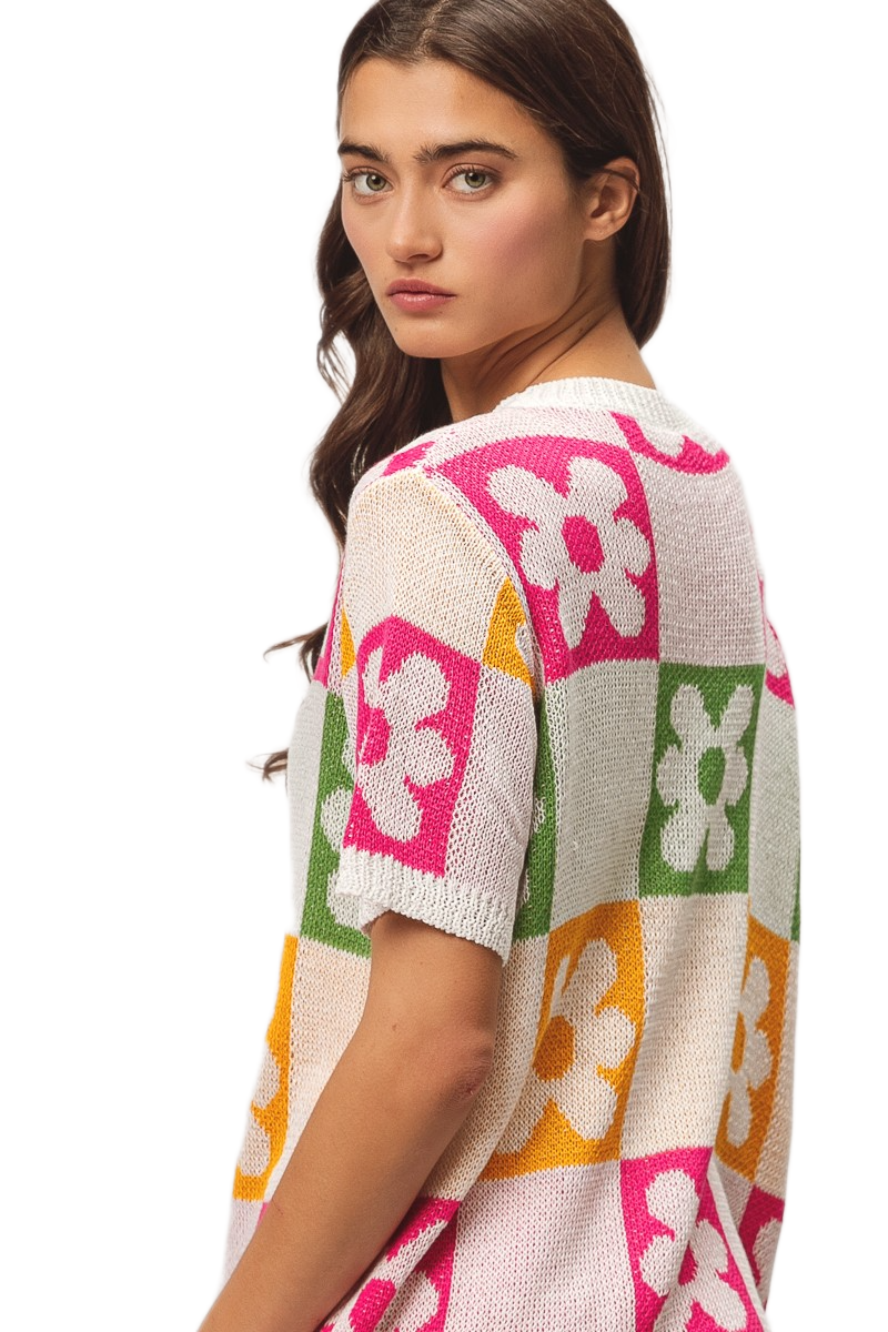 This vibrant pullover sweater features a stunning multi-colored floral block pattern that combines pink, green, orange, and white tones in a geometric design. Crafted from soft lightweight knit fabric, it offers comfortable breathability perfect for transitional seasons. The short sleeve design and relaxed fit make it ideal for casual everyday wear, while the bold floral motifs add a playful feminine touch. The round neckline and modern color blocking create a contemporary look that pairs effortlessly with various bottoms for versatile styling options.