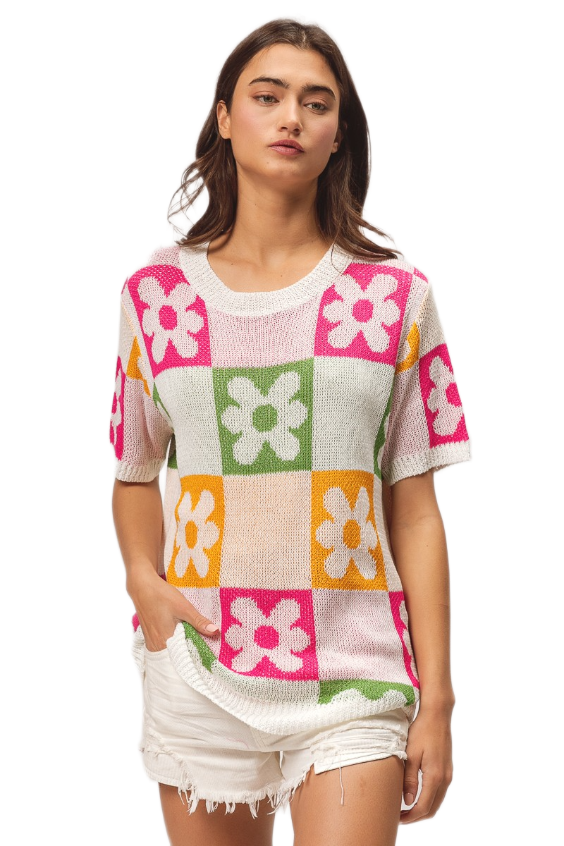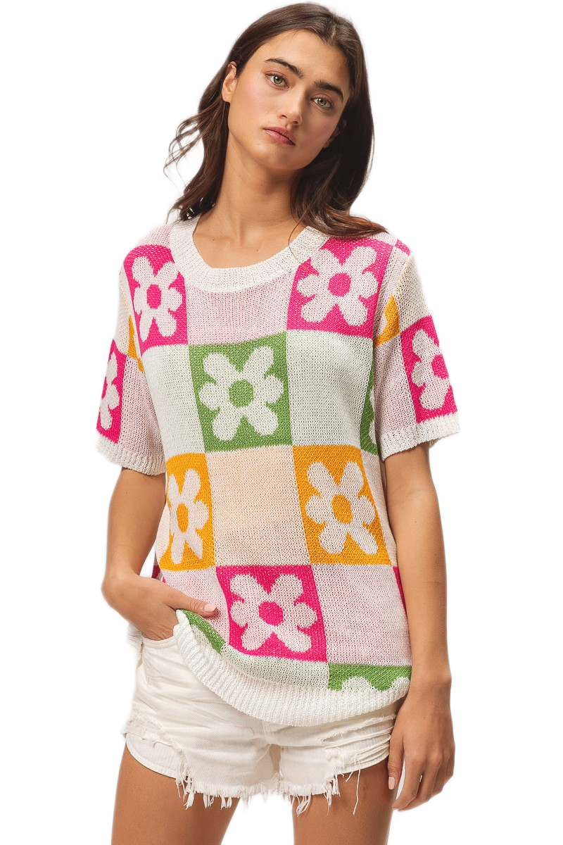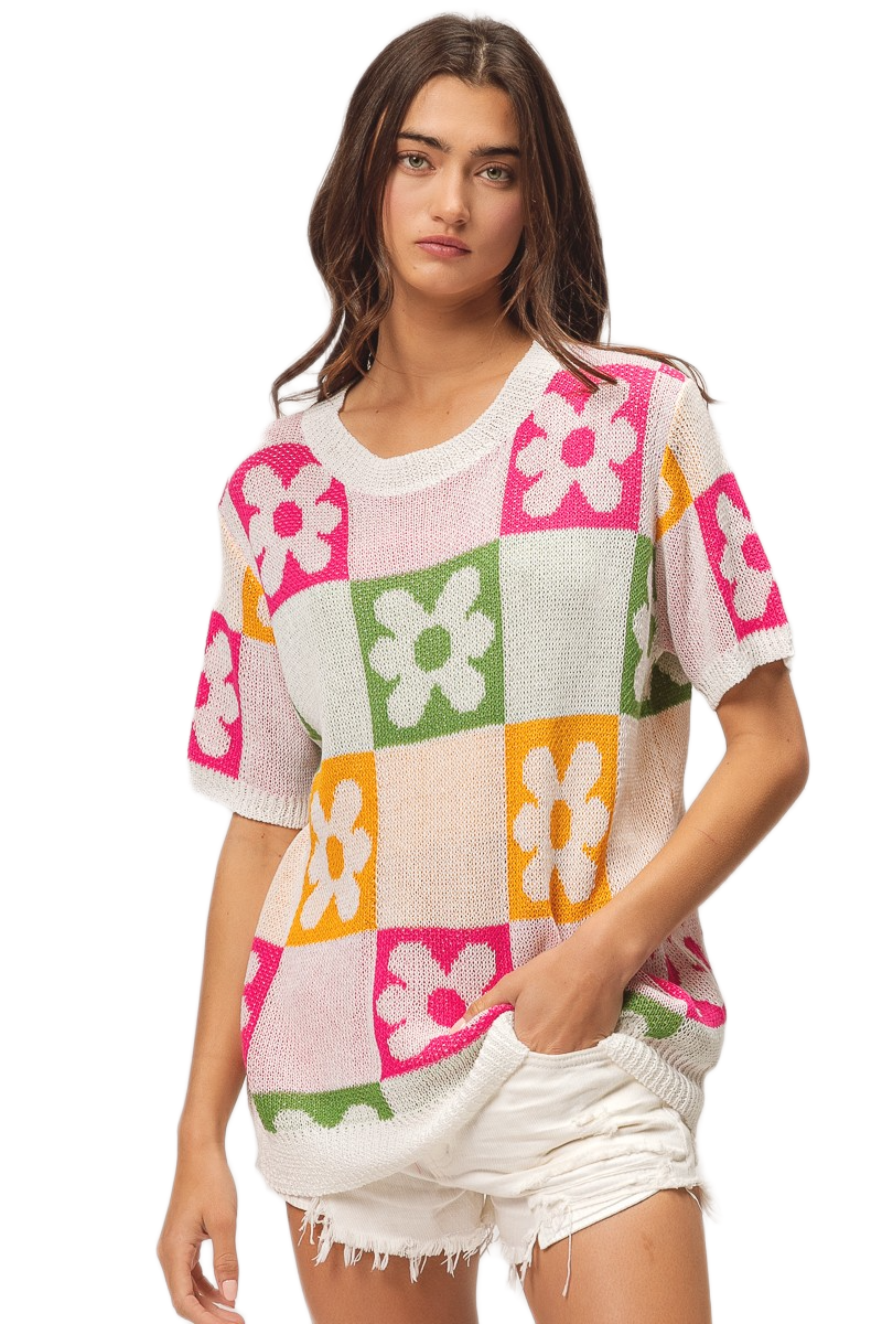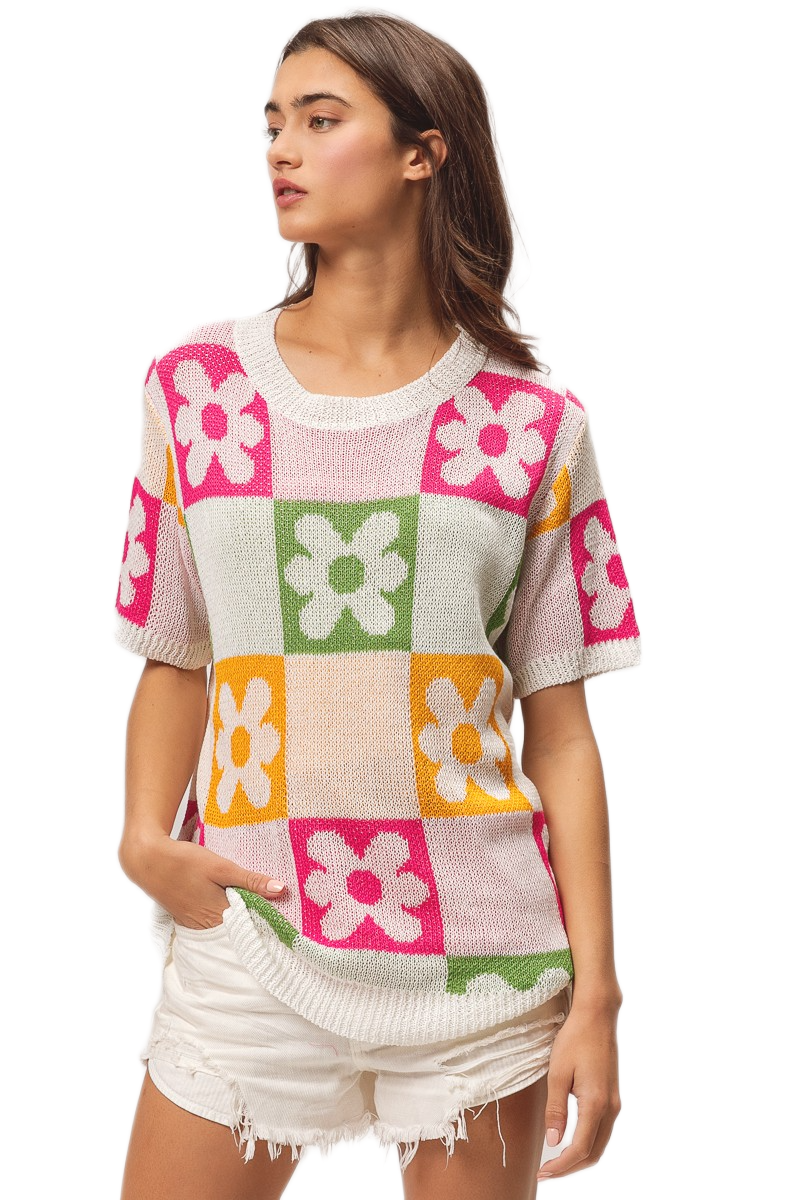 This vibrant pullover sweater features a stunning multi-colored floral block pattern that combines pink, green, orange, and white tones in a geometric design. Crafted from soft lightweight knit fabric, it offers comfortable breathability perfect for transitional seasons. The short sleeve design and relaxed fit make it ideal for casual everyday wear, while the bold floral motifs add a playful feminine touch. The round neckline and modern color blocking create a contemporary look that pairs effortlessly with various bottoms for versatile styling options.