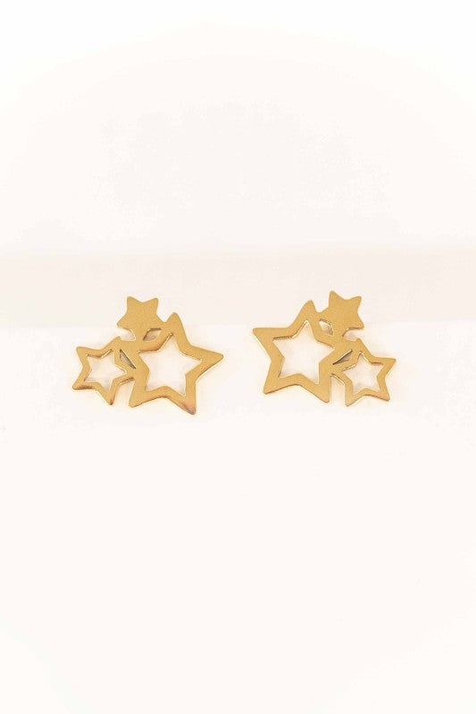 Three golden stars cluster together for these stud earrings.* Stainless Steel* 14k Gold platingMeasurements:* 0.31in 0.79cm