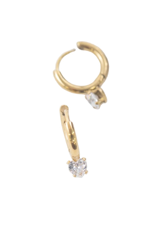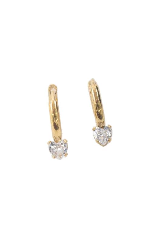 Gold huggie hoop earrings with a heart-shaped stone. * Stainless Steel* 14k Gold Plating* CZ Stone Measurement:* 0.19in* 0.49cm